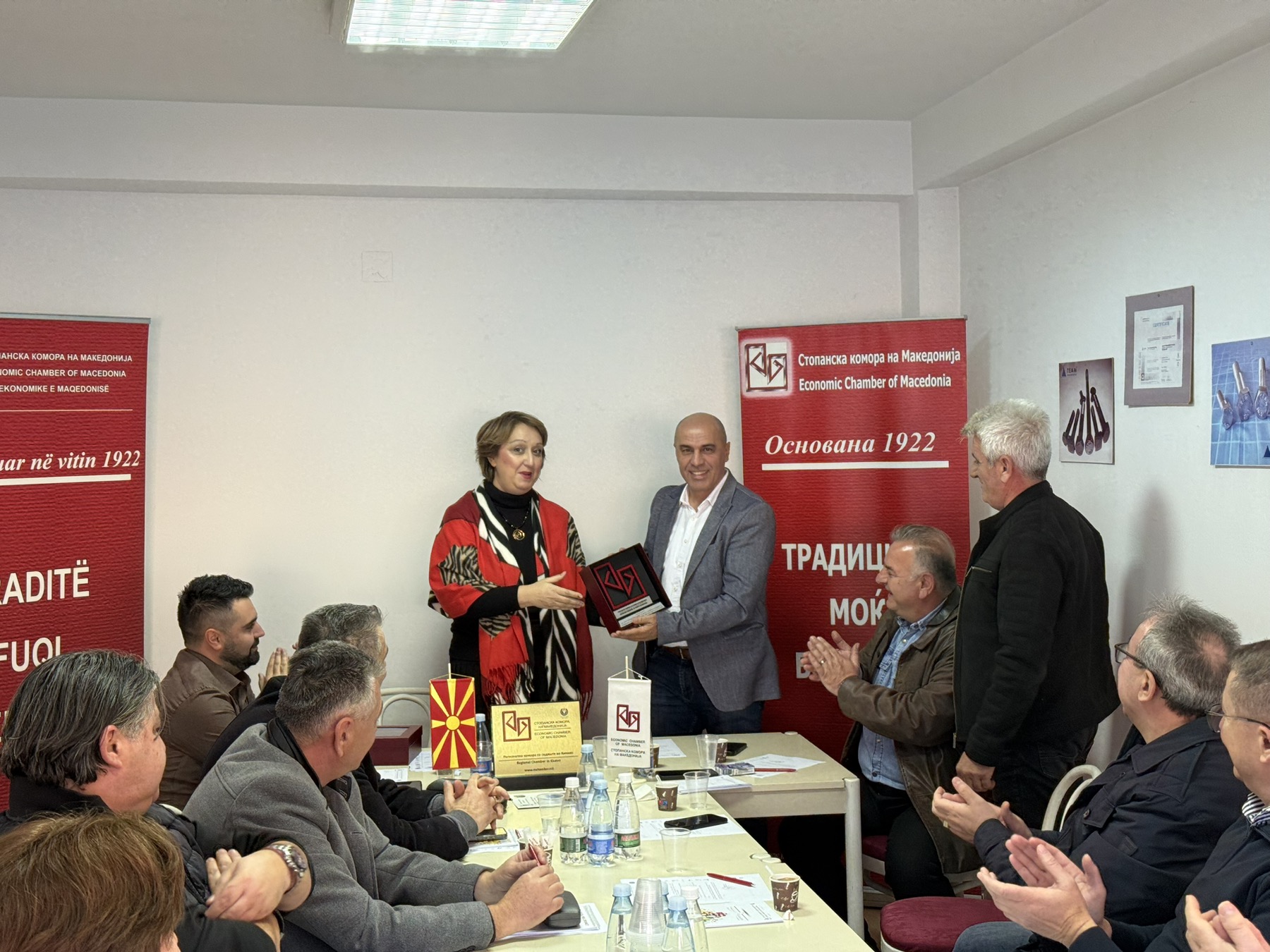 On her own behalf, on behalf of the Economic Chamber, and on behalf of the President of the Economic Chamber of North Macedonia, Branko Azeski, Dr. Georgieva-Jovevska presented Certificates of Recognition for significant contribution, selfless engagement and advancement of the Chamber’s activities to the outgoing President of the Regional Chamber, Igor Sokoleski, and to the outgoing Vice President, Alija Zulbearoski.