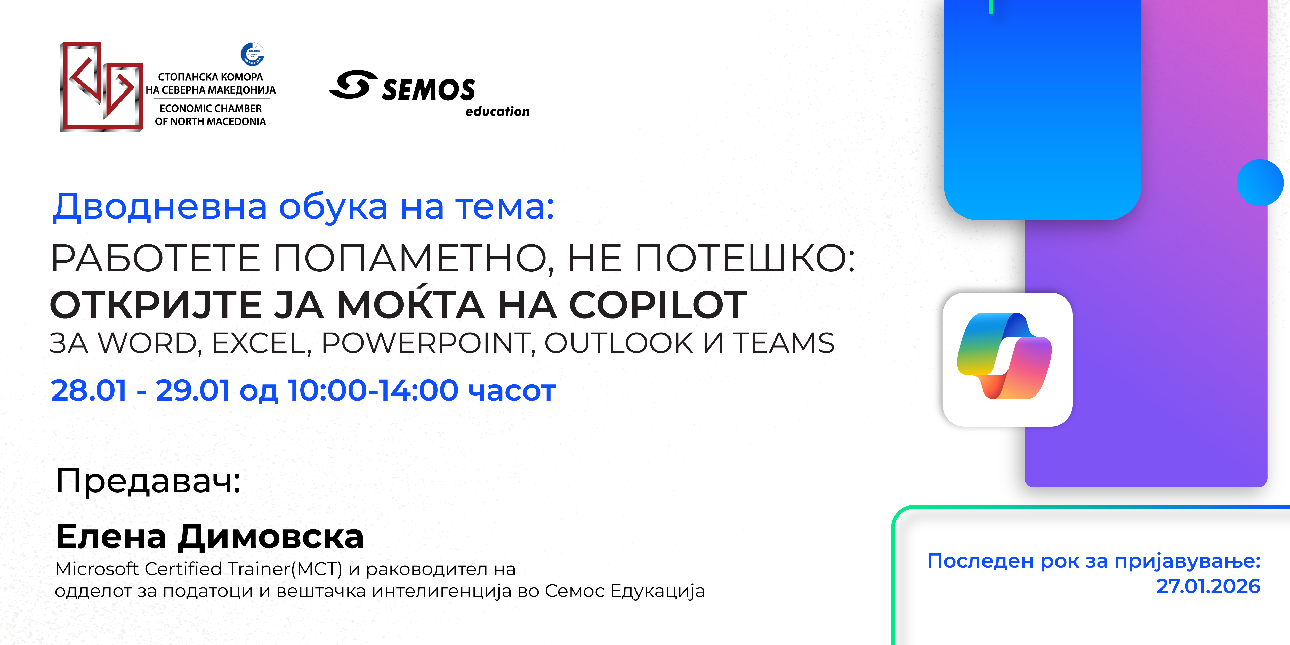 Во насока на приближување на дигиталните вештини до секоја компанија, Стопанската комора на Северна Македонија, во соработка со Семос Едукација, на 28 и 29 јануари 2026 година ја организираат обуката: „Работете попаметно, не потешко: Откријте ја моќта на Copilot за Word, Excel, PowerPoint, Outlook и Teams“