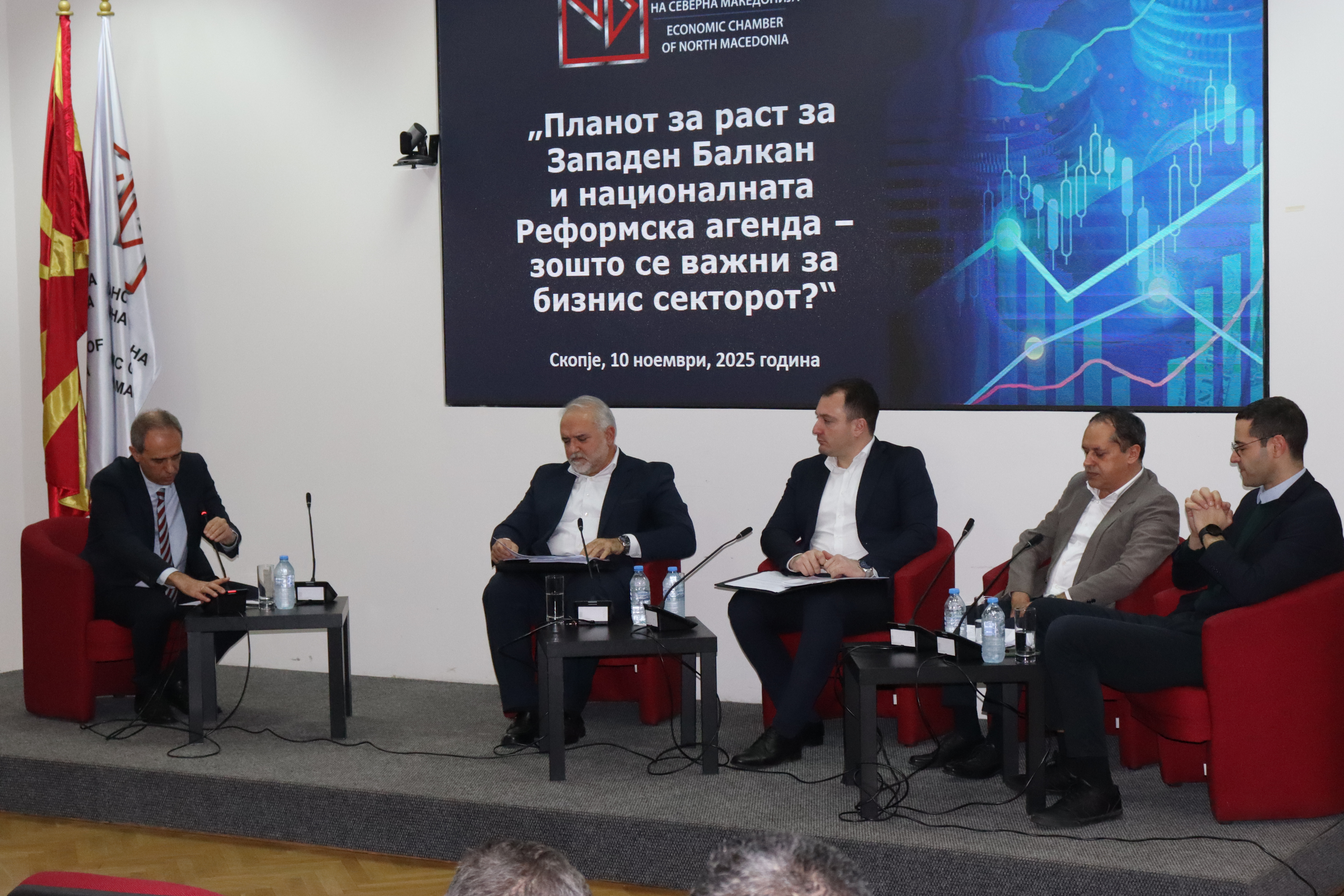 The Growth Plan for the Western Balkans, an initiative supported by the European Union, together with the National Reform Agenda, plays a key role in the country’s future economic development. These processes are not merely political or administrative—they provide direction that will shape the environment in which companies operate. For that reason, it is essential for the business community to clearly and promptly understand the mechanisms and goals behind these initiatives. With this in mind, a panel discussion was organized at the premises of the ECNM, where members and part of the Chamber’s management discussed how these reforms will impact the business climate and the country's economic progress.