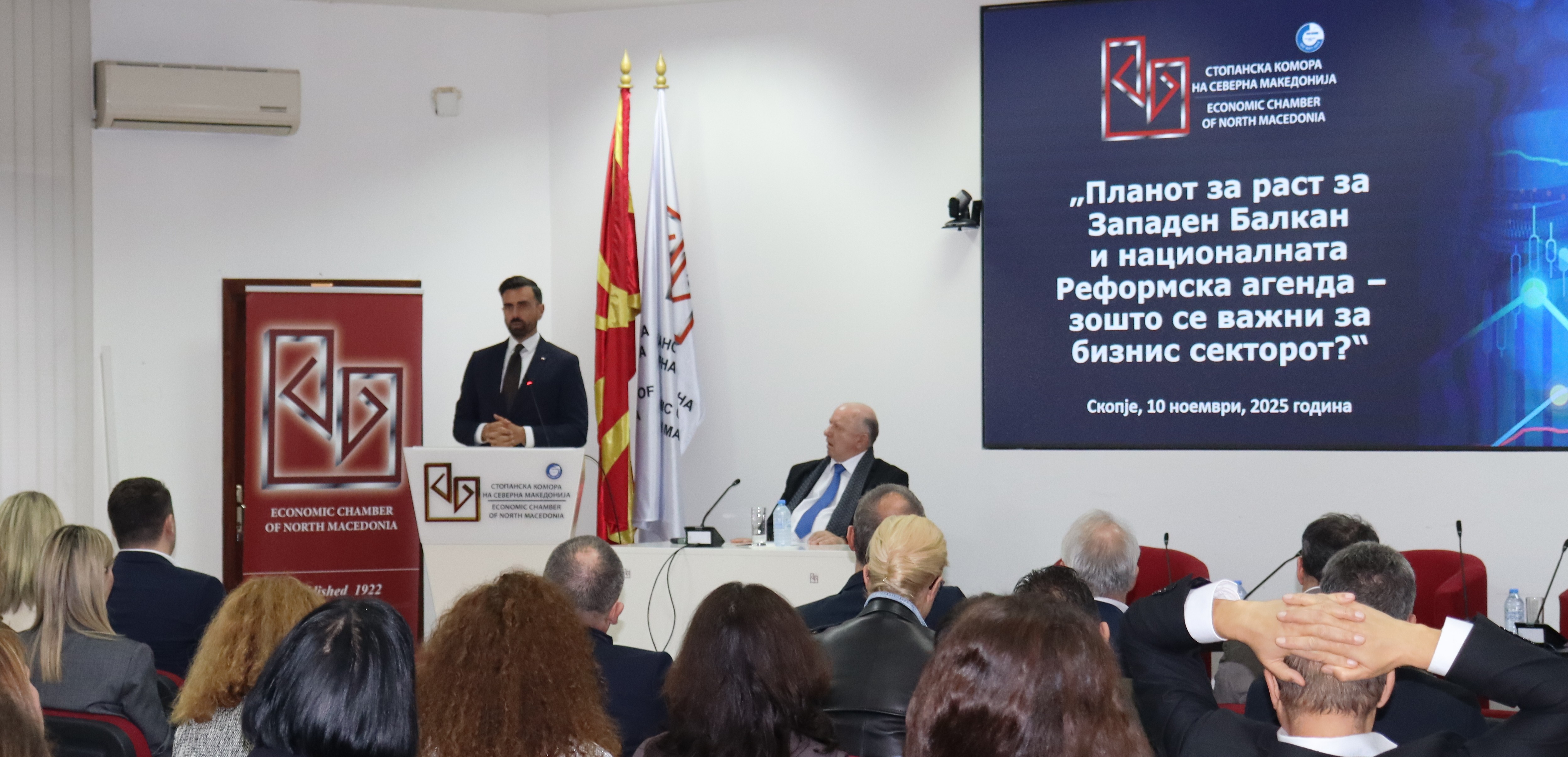 Настанот продолжи со панел дискусија. Во неа Драган Тилев, советник на министерот за европски прашања и член на Кабинетот, ги презентираше клучните елементи на Планот за раст за Западен Балкан и националната Реформска агенда, вклучително чекорите што треба да се реализираат, временската рамка за нивна реализација и финансиската страна целиот процес. Стефан Андоновски, министер за дигитална трансформација, зборуваше за активностите што ги презело министерството во рамки на Реформската агенда, како и проектите и активностите на кои работат во рамки на Планот за раст на Западен Балкан. Министерството за дигитална трансформација досега има постигнато забележителен успех на тој план, а од дигитализацијата која ќе го модернизира бизнис амбиентот корист ќе има и бизнис секторот. Стефан Ристовски, истражувач од Институт за европски политики (ЕПИ) –Скопје даде оценка за нивото на реализација на Планот за раст и реформската агенда во земјите од регионот. Тој посочи дека за сите вклучени земји од регионот има уште многу работа до целосна реализација на предвидените активности и дека динамиката мора да се забрза. Во панел дискусијата учествуваше и Глигор Цветанов, во улога на претседател на Клубот Европа, ова форма на делување во Стопанската комора. Тој ја објасни суштината на овој ново формиран клуб и ја истакна заложбата на Стопанската комора активно да учествува во процесите поврзани со евроинтегративниот процес. Панелот го модерираше Зоран Јовановски од Стопанската комора.